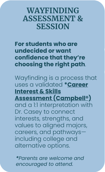 *Campbell™ Interest & Skill Survey is a proprietary assessment developed and owned by Campbell International. Dr. Casey is a certified provider authorized to administer and interpret the assessment, but is not affiliated with, endorsed by, or the owner of the Campbell™ assessment.